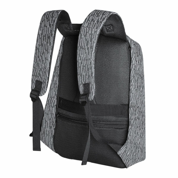 Hoge zichtbaarheid, reflecterende, anti-diefstal rugzak. Vervaardigd uit duurzaam, premium kwaliteit 600D polyester met een grijze afwerking. Vervaardigd met behulp van sterk reflecterende filamenten en miljoenen reflecterende pigmenten, gebaseerd op het principe van retro-reflectie van licht, een eigenschap van nachtelijke zichtbaarheid die bestaat uit de breking van licht terug naar de bron van oorsprong. Spatwaterdicht, met antidiefstalzak en trolleyhouder. Gewatteerde binnenvakken voor laptops tot 15 inch en tablets tot 12 inch. Gewatteerde schouder- en rugriemen.