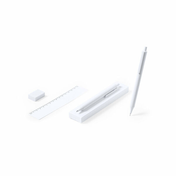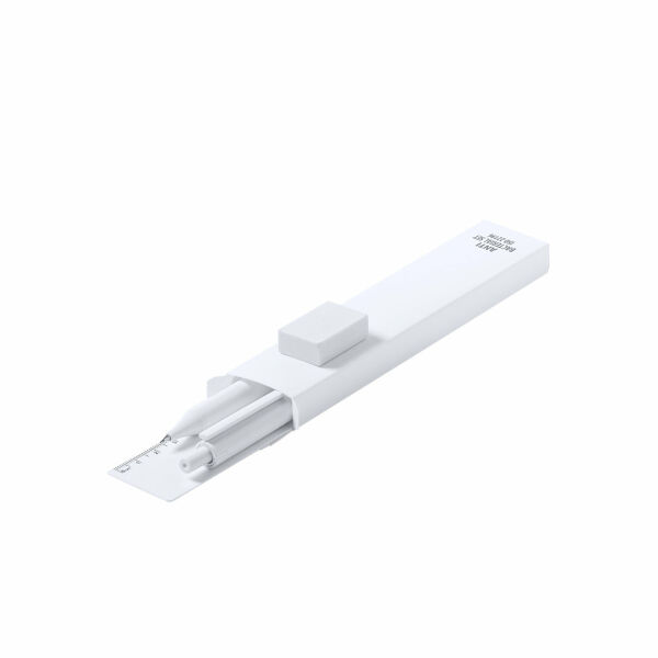 Antibacteriële set van resistent wit PP-materiaal. Bevat biros, mechanisch potlood (lood 0,5 mm inbegrepen), 15 cm liniaal en rubber. Producten met antibacteriële behandelingen zijn in staat om de bacteriële niveaus aanwezig op de oppervlakken van de materialen drastisch te verminderen, dankzij de toevoeging van permanente statische microbiële agentia, met een hoge effectiviteit in het afremmen en voorkomen van bacteriële besmetting. Item volgens de ISO 22196 norm, die de antibacteriële activiteit in plastic materialen en niet-poreuze oppervlakken bepaalt. Dit stelt ons in staat om de doeltreffendheid te kennen van de microbiële remming die additieven hebben op behandelde voorwerpen door middel van een kwantitave evaluatie.